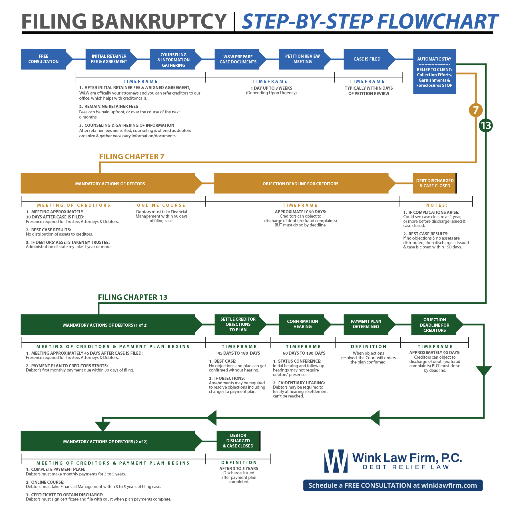 The first step in the bankruptcy process is a free consultation, in which The Wink Law Firm will review your situation. If bankruptcy is your most cost-effective option, The Wink Law Firm will provide you with a quote for our services based on the complexity of your situation.